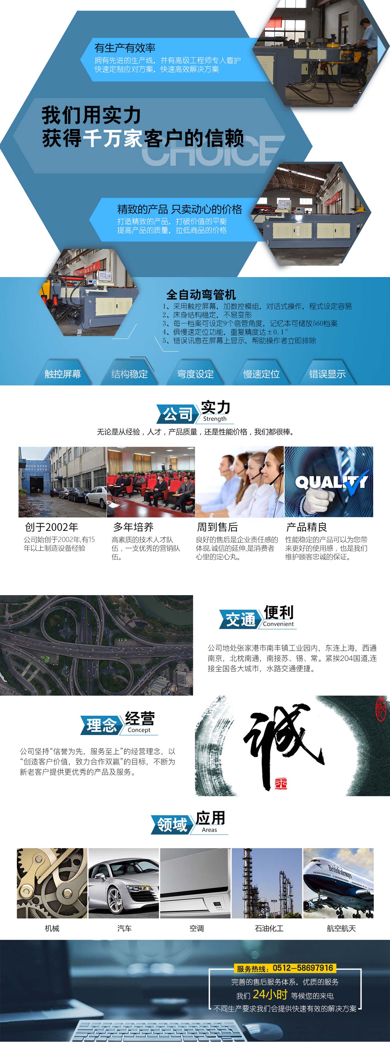 張家港市雙和機械制造有限公司始建于2001年,占地面積12000平方米,南鄰蘇州、無錫、上海,東鄰常州、南京,交通便利,位長三角中間地段,風景優(yōu)美的張家港。 雙和公司至創(chuàng)立開始,引進了國外的設計制造理念,組建了企業(yè)生產(chǎn)管理優(yōu)秀團隊,致力于管材加工機械研發(fā)、設計、制造。創(chuàng)新的設計理念,嚴格的質(zhì)量把關(guān),專業(yè)的售后服務,不斷提升了我在整個行業(yè)的影響力。 雙和公司生產(chǎn)的系列產(chǎn)品分為彎管機、切管機、縮管機、磨齒機、伺服彎管機、數(shù)控彎管機、液壓彎管機、自動切管機、管端成型機、倒角機、大弧滾圓機、鋁切機、壓彎機等管材加工機械,廣泛用于航天業(yè)、造船業(yè)、汽車制造、鍋爐制造、自行車、摩托車、體育健身器材、管制品家...